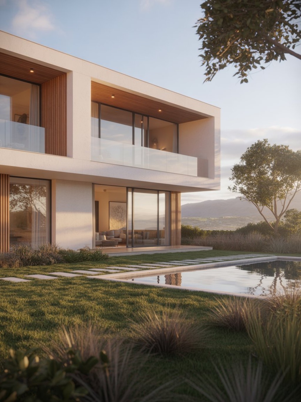 Sunrise Villa is a contemporary three-bedroom home designed for bright, airy living. The ground floor opens to a spacious open-plan living and dining area with floor-to-ceiling windows that bring the garden and pool into view. Natural wood finishes, stone accents and minimalist built-ins create a warm, elegant feel. Upstairs are three comfortable bedrooms including a master with an en-suite and balcony that faces the sunrise — perfect for morning tea.